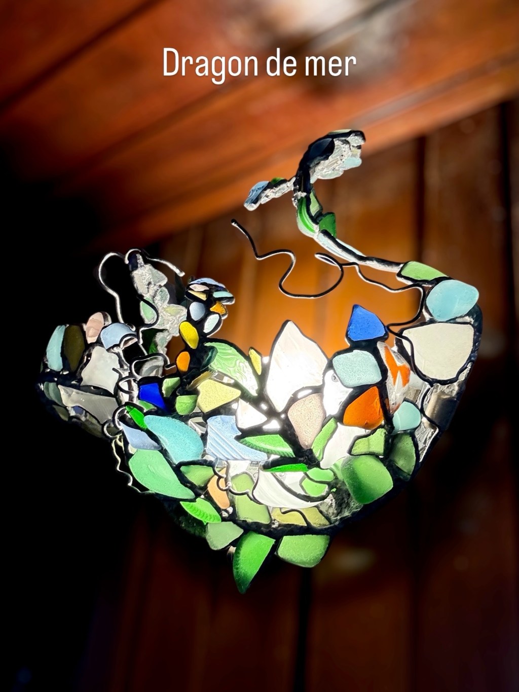 Voici ma lampe « Dragon de mer », réalisée exclusivement à partir de verres de bouteilles trouvés sur les plages.